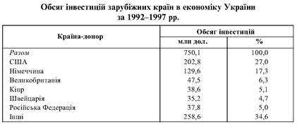 Характеристика та обсяги іноземних інвестицій в Україні в 90-х роках XX ст.За розрахунками, загальний обсяг необхідних іноземних інвестицій в економіку України має перевищувати 40 млрд дол. США, у тому числі для металургії — 7, машинобудування — 5,1, транспорту — 3,7, хімії та нафтохімії — 3,3 млрд дол. Сьогодні в Україну інвестовано у 30 разів меншу суму, однак Україна має потенційні можливості для ефективного освоєння інвестицій на суму близько 2,5 млрд дол. щорічно. Залучення таких коштів уможливить реконструювання пріоритетних галузей промисловості впродовж п'яти років. Але нині щорічні обсяги іноземних інвестицій в Україну у 3-7 разів менші. При цьому слід ураховувати, що залучення іноземних інвестицій також потребує певних витрат. За розрахунками, за залучення 1 млн дол. необхідно сплачувати близько 30 тис. дол.