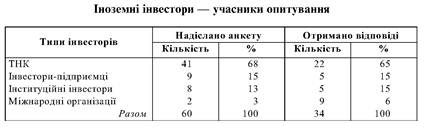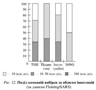 Зауважимо, що міжнародні фінансові організації є для України одним з найбільших джерел ПП. Інші інституційні інвестори (особливо приватні інвестиційні фонди) також здійснюють великі прямі інвестиції. Кошти, якими розпоряджаються ці фонди, становлять десятки, а іноді й сотні мільйонів доларів. У групі ТНК компанії з обсягом інвестицій, меншим за 10 млн дол., належать до категорії “потенційні інвестори”, оскільки поки що тільки планують вкласти великі кошти в повномасштабну діяльність в Україні (не враховуючи відкриття своїх представництв та створення мережі дистрибуції). Але понад половини ТНК, що ввійшли до вибірки, вже інвестували в економіку України від 10 до 100 млн дол.