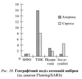 Американські компанії в нашій вибірці є лідерами за кількістю (цей показник відповідає офіційним статистичним даним). Серед опитаних 34 компаній 19 мають штаб-квартиру у США, одна — в Канаді, решта — у країнах ЄС та інших європейських країнах. Більшість серед ТНК та інвесторів-підприємців становлять американські компанії, а серед інституційних інвесторів переважають європейські компанії.