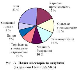 У сформованій вибірці основні типи інвесторів представлені нерівномірно (рис. 10). Відсутність балансу відображає той факт, що більшість інвесторів за обсягом інвестицій в Україну — це транснаціональні компанії. До того ж саме транснаціональні компанії є нашою цільовою групою з огляду на ті переваги, які ТНК дають Україні як стратегічні інвестори (завдяки передовим стандартам провадження бізнесу). Тому ТНК становлять 2/3 респондентів опитування. Наведена діаграма відображає структуру вибірки за галузями інвестування (рис. 11).