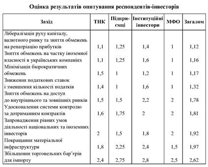 • зниження податкових ставок і зменшення кількості податків. Усі категорії інвесторів майже одностайно підтримують таку позицію. Проте можна спостерігати певну відмінність у позиціях ТНК та інших груп інвесторів. Якщо ТНК наголошують на лібералізації руху капіталу, валютного ринку та репатріації прибутків, а також на знятті обмежень на частку іноземної власності в українських компаніях, то інші групи інвесторів найнагальнішими завданнями уряду вважають мінімізацію бюрократичних обмежень, зниження податкових ставок і зменшення кількості податків. Таку різницю в оцінках можна пояснити кращою спроможністю ТНК (порівняно з інвесторами-підприємцями та приватними інституційними інвесторами) обстоювати свої інтереси.