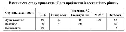Оскільки приватизацію вважають вагомим фактором залучення ПП у країни з перехідною економікою, “інвестиційна” анкета містила також запитання щодо важливості приватизації в Україні. Як і треба було сподіватись, більшість інвесторів визнали приватизацію вагомим чинником. Лише 5 % респондентів (великі ТНК) вважають стан приватизації неважливим для своєї діяльності. Решта інвесторів (95 %) зауважили, що політика приватизації є визначальним чинником для прийняття інвестиційних рішень (табл. 25).