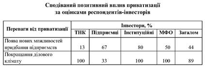 Важливість приватизації для появи нових можливостей придбання підприємств визнали більшість інституційних інвесторів та інвесторів-підприємців. Ці відповіді варто порівняти з попередніми висновками про те, що ТНК не покладалися і великою мірою не покладаються на приватизацію як на спосіб, що дає змогу увійти на український ринок. Таку позицію можуть зумовлювати і надто мала кількість привабливих з точки зору ТНК підприємств, де відбувається приватизація, і скептицизм ТНК щодо прозорості процесу приватизації.