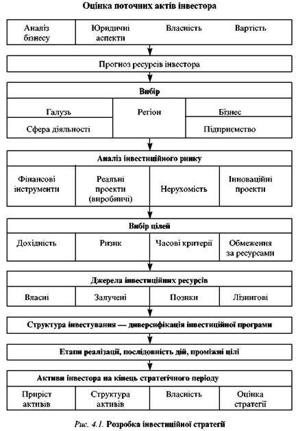 Формування стратегії є дослідженням довгострокових напрямів розвитку інвестора. Виконання цих робіт може бути представлено, наприклад, послідовністю дій, відображених на рис. 4.1.