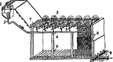 1 - дозуючий бак; 2 - сифон; 3 - спрінклери (розбризкуючі); 4 - магістральна труба; 5 - розподільні труби; б - дренаж із плиток; 7 - повітряні канали для дренажу; 8 - завантаження фільтра (шлак діаметром 10-20,20-40, 50-70 мм); 9 -канал для відведення очищеної води.
