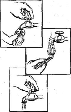 Для санітарно-мікробіологічного аналізу проби води відбирають у стерильний посуд. Руки перед відбором води знезаражують. Забір проби води з водорозбірного крана проводять після попередньої очистки і обпалювання його і подальшого спуску води протягом 10 хвилин при повністю відкритому крані з дотриманням правил стерильності. Посуд відкривають безпосередньо перед забором, виймаючи корок разом із стерильним ковпачком (рис. 5). Під час відбору води корок і горловина не повинні доторкатися до нестерильних предметів. Посуд перед забором споліскувати не треба. Відразу ж після відбору бутель негайно закривають стерильним корком так, щоб він не досягав води, і ковпачком та обв'язують по шийці шпагатом.