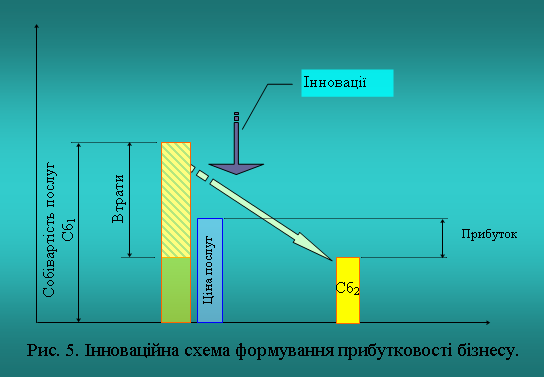 Якщо собівартість послуг підприємства перевищує ринкову ціну через значні втрати, то за рахунок інвестиційно-інноваційних рішень зменшують собівартість і, таким чином, досягають прибутковості підприємства (рис. 5.). "Як економічна теорія, так і здоровий глузд говорять про те, що рентабельність роботи фірми в даній стратегічній зоні господарювання буде пропорційною зробленим в цю зону капіталовкладенням" [9]. Тобто, інвестиції йдуть попереду рентабельності і є її чинником. Правила прийняття рішень з вибору стратегічної позиції, розглянуті І. Ансоффом не передбачають в жодному з випадків простого підвищення ціни на продукцію.