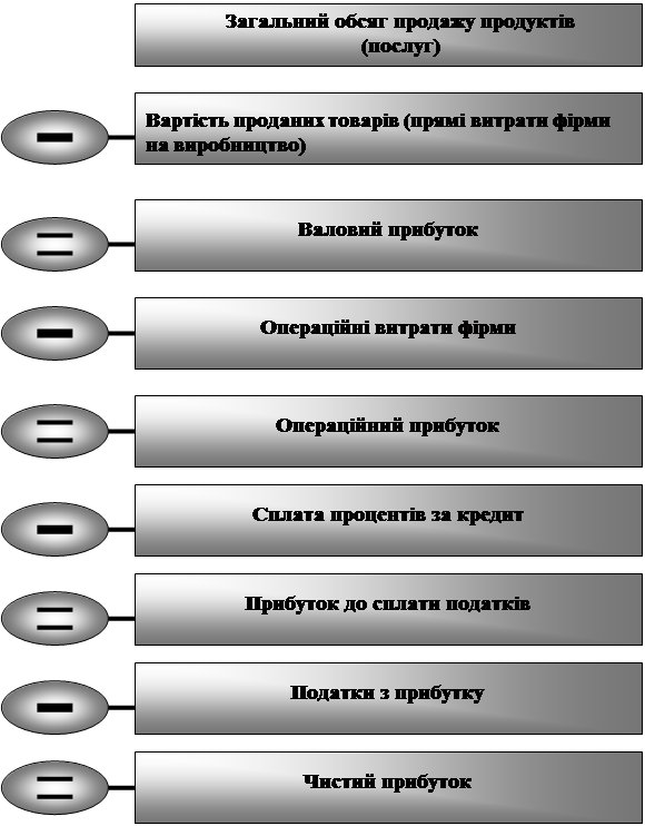 Логіка опрацювання плану доходів і видатків (Рис. 2) передбачає визначення загальної суми продажу продуктів фірми, від якої поступово відраховуються різні види витрат фірми і в результаті обчислюються: валовий прибуток, операційний прибуток, прибуток до сплати податків, чистий прибуток.