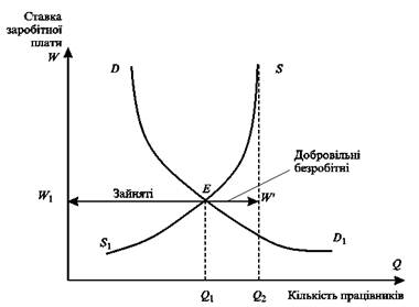 Економіка може бути ефективною і за наявності деякого добровільного безробіття. На рис. 2 (с. 76) добровільне безробіття показане відрізком між точкою рівноваги Е та рівнем запропонованої на ринку праці робочої сили. Якщо попит на робочу силу зросте, то ставка заробітної плати також збільшиться (крива попиту зсунеться вправо). Добровільне безробіття також скоротиться, тому що ставка заробітної плати збільшиться.
