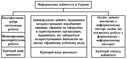 Аналіз неформальної зайнятості спирається на її класифікацію за такими критеріями (див. схему 3 на с. 65):