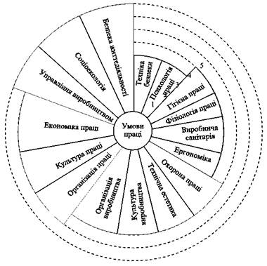 Останніми роками все чіткіше простежується тенденція виділення умов праці до особливої галузі науки та практики. Праця (а відповідно — й її умови) здійснюється у межах різних систем: з одного боку, "людина — машина" (технологічний процес), "людина — середовище", "людина — машина (технологічний процес) — середовище", а з іншого — "людина — колектив — суспільство", "людина — сус-пільство-природа". Перші три системи щодо умов праці характерні для виробничого місця, дільниці, цеху, виробництва, а останні дві — для вищого рівня, тобто підприємства, галузі, регіону. Усі означені системи праці пов'язані з цілим комплексом наукових дисциплін і практичних напрямків (див. рис. на с. 105).