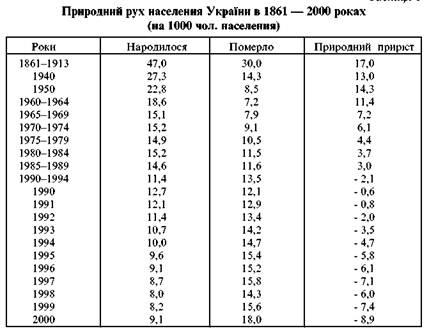Зміна населення пов'язана з безперервним його поновленням в результаті процесів народжуваності та смертності. Природний рух населення України зображено в табл. 1 (с 5). При цьому показники народжуваності (RH) та смертності (Rn) розраховуються на 1000 чоловік населення у такий спосіб: