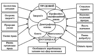 Під трудовим потенціалом розуміється розвинута в даному суспільстві сукупність демографічних, соціальних та духовних характеристик і якостей працеактивного населення, що реалізовані або можуть бути реалізовані в умовах досягнутого рівня розвитку продуктивних сил, науково-технічного прогресу та системи відносин щодо участі в процесі праці та суспільній діяльності. Природною основою формування трудового потенціалу є демографічне відтворення, що забезпечує безперервне поновлення поколінь людей як фізичних носіїв всіх соціальних якостей системи відносин. З іншого боку, трудовий потенціал — це є максимально можлива величина, що визначає участь трудящих у виробництві за екстремальних умов з урахуванням їх психофізичних особливостей, рівня професійних знань та набутого досвіду. Основними чинниками формування трудового потенціалу є такі (див. схему 3):