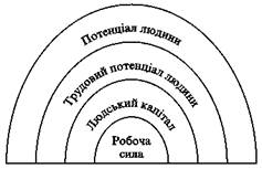 Стосовно окремо взятої людини взаємозв'язок між трудовим потенціалом та такими поняттями, як "потенціал людини", "людський капітал" та "робоча сила" можна представити у такий спосіб (див. схему 4 нас. 16):