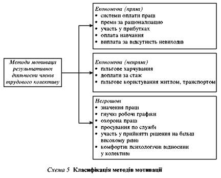 У цьому значну роль відіграє мотивація, що є основою будь-якої поведінки людини і зусиль, спрямованих на підвищення результативності діяльності. Слід зазначити, що мотивація — це є процес, який спонукає окрему людину або групу людей на досягнення цілей організації. Мотивація трудової діяльності — складний, відносно стійкий процес, обумовлений певними особистісними характеристиками людини, а також певною необхідністю задоволення її потреб та їх відповідності зовнішнім умовам в процесі діяльності. Вона є сукупністю внутрішніх і зовнішніх сил, що спонукають людину до діяльності, зумовлюють поведінку, форму діяльності, надають цій діяльності спрямованості, яка орієнтована на досягнення особистих цілей і цілей організації. Це досягається за допомогою методів, що класифікуються у певний спосіб (див. схему 5 на с. 226).
