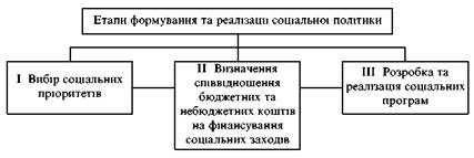 Формування та реалізація соціальної політики відбуваються у три етапи (див. схему 2):