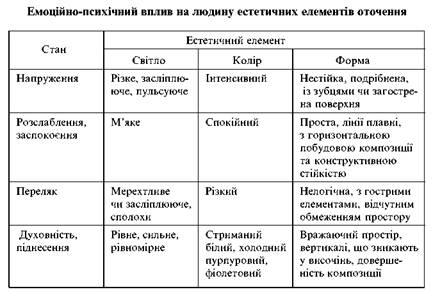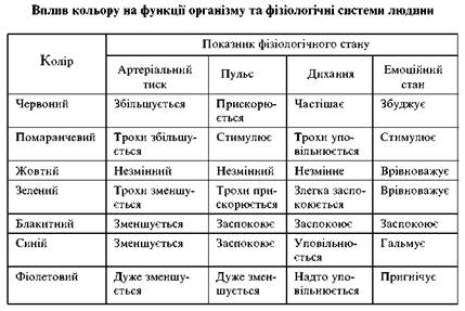 До психофізіологічних показників належать також естетичні фактори. Як свідчить практика, на підприємствах, де проведені заходи з технічної естетики, значно покращились умови праці, зменшилася кількість випадків виробничого травматизму у 2-3 рази, а в окремих місцях навіть у 4-5 разів [65]. Тому оцінка рівня естетичної культури виробництва з позицій охорони праці орієнтує враховувати у планах соціального розвитку підприємства та у підсумках трудової діяльності наступні характеристики: естетичний стан території, виробничих приміщень, застосування функціональних естетичних елементів для запобігання нещасним випадкам, а також спеціальних засобів естетичного впливу для зняття психічного напруження (кімнати психологічного розвантаження, лазні-сауни, гігієнічні душові, молочні бари тощо). Вплив кольору на функції організму наведено у табл. 5, емоційно-психічний вплив на людину естетичних елементів оточення — у табл. 6.