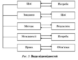 2) можливості — потреби, засоби — цілі (функції), права — обов’язки.