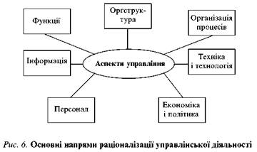 На рис. 6 наведено основні напрями раціоналізації управлінської діяльності. Розрізняють дві групи напрямів: