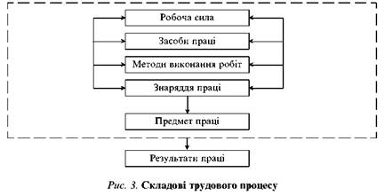 Трудовий процес складається із робочої сили, засобів праці, методів виконання робіт, знарядь праці, предметів праці (рис. 3).