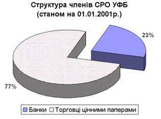 Протягом року до складу членів СРО УФБ війшли 31 торговець цінними паперами, виключено - 15. Структура членів СРО УФБ представлена 34 банківськими установами та 112 торговцями цінними паперами. Серед зареєстрованих на біржі брокерських контор 25 отримали дозвіл ДКЦПФР на здійснення професійної діяльності зберігача цінних паперів (17 з них - банки, 8 - торговці цінними паперами). Зміцненню біржової інфраструктури в певній мірі сприяє діяльність філій УФБ, 5 з яких протягом 2000 року активно працювали у реалізації приватизаційних завдань.