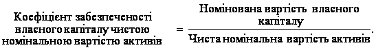 Для оцінювання ліквідності використовується також коефіцієнт забезпеченості власного капіталу чистою номінальною вартістю активів, який розраховується за формулою: