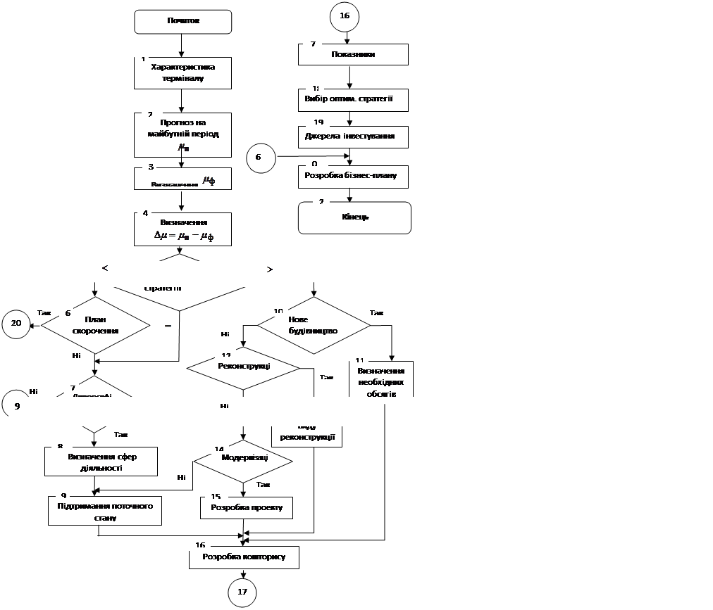 1) Якщо немає можливості завантажити виробничі потужності, тобто відкрити перспективні рейси, утримання терміналу не має економічного сенсу, необхідно обрати стратегію ліквідації або згортання діяльності (блок 6) в цьому випадку моделювання припиняється, управління передається до блоку 21, який відповідає за розробку плану скорочення.