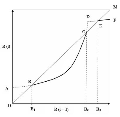 На рис. 1.1. зображена діаграма зміни B(t) від В(t – 1). Крива (ABCD) відповідає першому рівнянню із системи. Вона перетинає лінію ОМ (ця лінія має нахил 45%, тобто це лінія – B(t) = В(t – 1) ) в двох точках, B і С. Пряма DF, що представляє друге рівняння системи, перетинає лінію ОМ в точці Е. Таким чином, існує три точки рівноваги і тільки в точках В і Е рівновага є стійкою.