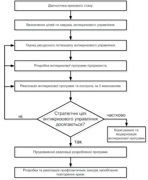 Забезпечення реалізації курсу на стійке зростання економіки України робить надзвичайно актуальним питання організації протидії кризовим явищам та відродження нормального перебігу функціонування підприємств потребує розробки моделі процесу антикризового управління.