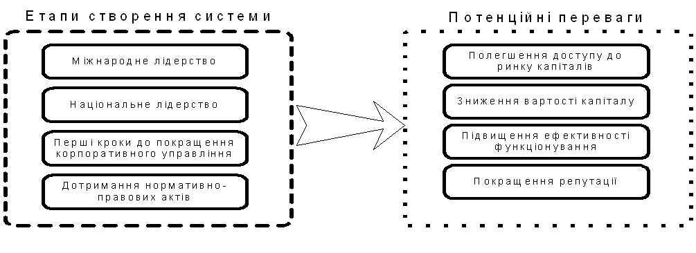 На наш погляд, процес формування системи ефективного корпоративного управління в Україні є надзвичайно складним, комплексним і враховує багато факторів як на макро- так і на мікрорівнях національних економік країн. Автори журналу Corporate Governance вважають, що існують наступні етапи створення системи ефективного корпоративного управління, а саме[2]: