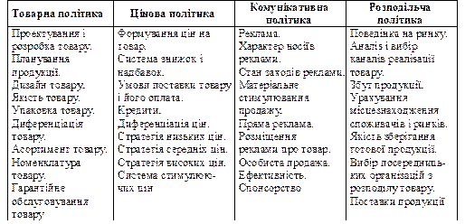 Маркетингова політика включає такі основні інструменти, які безпосередньо впли-вають на формування прибутку підприємства і при повному задоволенні потреб споживачів. Основні інструменти маркетингової політики підприємства можна згрупувати так (табл. 1).