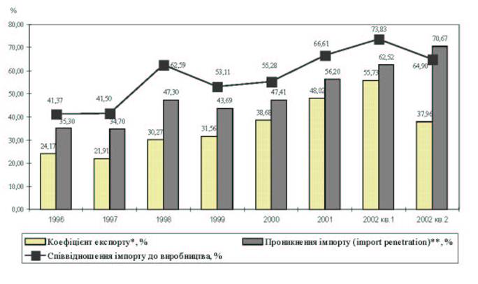 * Імпорт в процентах до внутрішнього попиту. ** Включається авіабудування, виробництво офісної та комп’ютерної техніки, фармацевтика, комунікаційна та радіотелевізійна техніка. *** Включається автомобілебудування, машинобудування, виробництво електричних машин. **** Включається паперова та поліграфічна промисловість, суднобудування та ремонт, виробництво неметалевих мінеральних виробів, виробництво чорних і кольорових металів та виробництво неметалевих мінеральних продуктів. ***** Країни Організації економічного співробітництва і розвитку (ОЕСР). Джерело: Розраховано за даними Держкомстату України та статистичних бюлетенів про основні показники роботи промисловості України за січень–грудень 1998–2001 рр.; експрес інформації Держкомстату України “Зовнішня торгівля товарами за 1998–2001 рр.”; Science, Technology and Industry Scoreboard 1999 Benchmarking Knowledge-based Economies. – Р. 62–66. | |||||||||||||