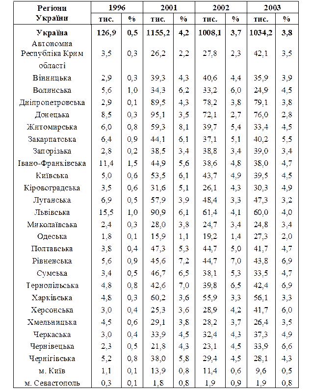 На початку 2003 року офіційно зареєстроване безробіття в Україні становило 3,8 %. У цілому в Україні нараховується близько 1 млн безробітних. Найвищий рівень безробіття зареєстрований у Рівненській (6,9 %), Тернопільській (6,9), Чернівецькій (6,6), Херсонській (6,0) областях; найнижчий – в Одеській (2,0) та Донецькій (2,3) областях, а також у містах Києві (0,5) і Севастополі (0,8 %) (табл. 1).