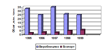 Враховуючи найбільш низький за останні роки валовий збір зернових у 1999 р. та передбачаючи проблеми у власному забезпеченні населення хлібопродуктами, з України все ж було експортовано значні обсяги зерна (рис. 3).