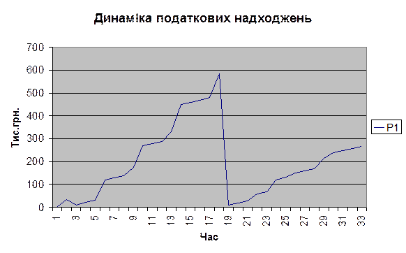 Аналізуючи дані таблиці, можна зробити висновок, що податкова ставка має тенденцію до падіння, а податкові надходження до зростання, що, у свою черг, не суперечить кривій Лаффера. Динаміку зміни податкових надходжень можна також побачити на наступній діаграмі. Значний спад коштів у момент 18 пов’язано із закінченням першого бюджетного року та встановленням значення податкових надходжень у початковий стан.