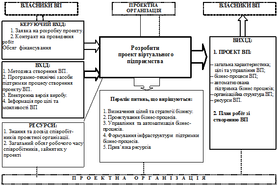 – проект конкретного віртуального підприємства, що містить опис ВП (загальна характеристика, бізнес-процеси, автоматизована підтримка управління бізнес-процесами, організаційна структура, ресурси) та перелік робіт по його створенню та експлуатації;