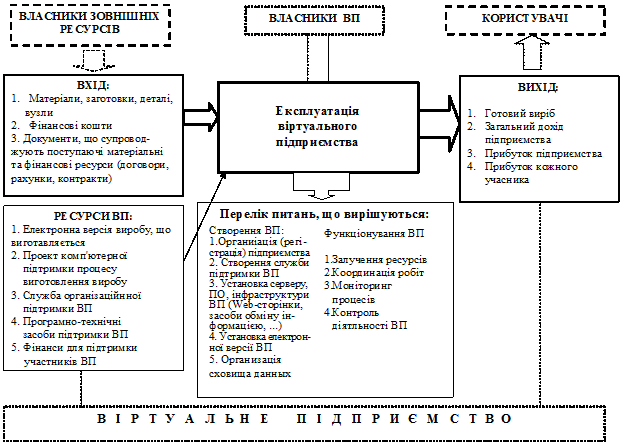 Експлуатація віртуальних підприємств (рис. 3) потребує виконання робіт, пов’язаних зі створенням самих підприємств і їхнього функціонування.
