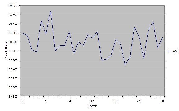 3) протягом усього часу моделювання курс валюти поводився досить нестабільно – то зростаючи, то спадаючи (граф. 1), що все-таки не завадило банку в остаточному підсумку збільшити свій капітал на 5 тисяч (а4(30) =11769,756).