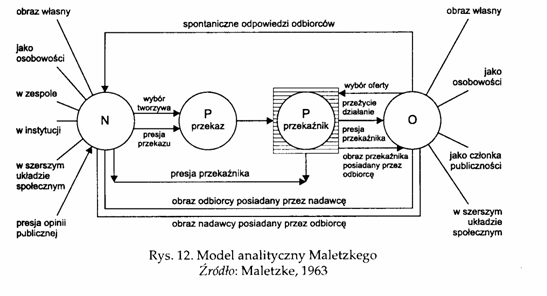Аналітична модель, або модель Малецького. Ця модель, сконструйована в 1963 році західнонімецьким психологом Ґ. Малецьким, відрізняється від моделі Рілеїв наявністю психологічних змінних: особистість комунікаторів, взаємосприйняття учасників процесу, належність до колективів у межах різних інституцій тощо.