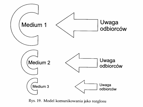 Комунікація на такій моделі розглядається як спектакль, де публіка споглядає, але не бере участі. При цьому факт уваги є більш важливим, ніж якість уваги. В увазі до засобу сила ЗМК, яка стає важливим компонентом формування суспільної свідомості. ЗМК робить все, аби здобути увагу аудиторії, у цьому криється "медійна логіка".