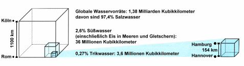 Vorkommen Da nur 0,27 % des Wassers auf der Erde Trinkwasser ist, gibt es natürlich keine gerechte Aufteilung. Und so zum Thema zurück. Die Wasservorräte auf der gesamten Erde betragen ca. 1,38 Milliarden Kubikkilometer, dies ist ein Drittel der Erde. Davon sind allerdings 97,4 % Salzwasser und somit für den Menschen als Trinkwasser unbrauchbar. Lediglich 2,6 % ( 36 Millionen Kubikkilometer) des Wassers ist Süßwasser, wobei hier das Wasser aus Eismeeren und Gletschern eingeschlossen ist. Insgesamt bleiben nur noch 0,27 % Trinkwasser ( 3,6 Millionen Kubikkilometer) für die Bevölkerung der gesamten Erde übrig.