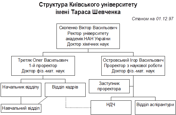 Нижче наводиться приклад частини діаграми організаційної структури Київського університету імені Тараса Шевченка, яка утворена за допомогою Microsoft Organization Chart.