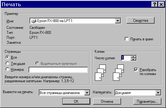 Відразу скажемо, що тип принтера, ім’я якого виводиться у полі «Имя:» групи «Принтер», повинний відповідати дійсності (тому принтеру, який зараз підключений до вашого комп’ютеру).