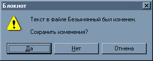 Создать – створення нового документа. Оскільки Блокнот призначений для роботи з одним документом, попередній документ буде закрито. Причому, якщо він не був збережений, на екрані виникає вікно з попередженням про необхідність збереження документа. |