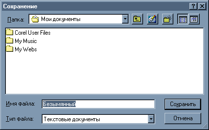 Сохранить – збереження файлу під тим же ім’ям і в тому ж місці. Якщо запам’ятовувати новий файл, автоматично буде відкрито діалогове вікно Сохранение. |