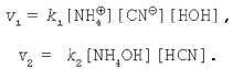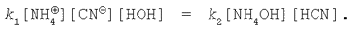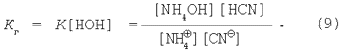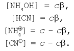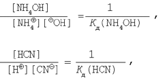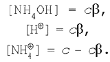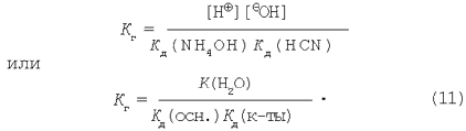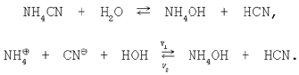 Нехай вихідна концентрація солі ціаніду амонію в реакції гідролізу дорівнює с. Вихідні концентрації катіона амонію і ціаніду-аніона також можна вважати рівними з (пам'ятаючи, що сіль – сильний електроліт). Тоді рівноважні концентрації приймуть значення: