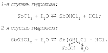 Наприклад, при додаванні до розчину хлориду сурми(III) дистильованої води спостерігається утворення осаду SbOCl, що свідчить про протікання реакції гідролізу солі SbCl3 по другій ступіні. Саме друга ступінь гідролізу хлориду сурми(III) приводить до утворення основної солі Sb(ВІН)2Сl, розкладання якої і дає осад хлориду оксосурьми.