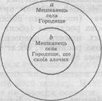 скоїла злочин X», дорівнює обсягу поняття «мешканець села Городище», якщо відомо, що злочинець є мешканцем названого села: а + Ь = а (схема 10).