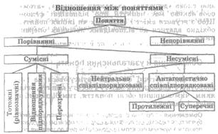 Графічне зображення відношення між обсягами несумісних понять пов'язане з певними труднощами. Це стосується насамперед двох нейтрально співпідпоряд-кованих понять, які вичерпують увесь обсяг відповідного родового поняття. Подібна схема (схема 6) нічим не буде відрізнятися від схеми суперечних понять.