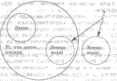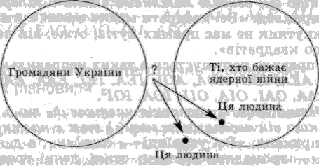 Та навіть знаючи будову силогізму і правила термінів, не завжди можна відрізнити правильні силогізми від неправильних. Так, силогізм «Жоден громадянин України не бажає ядерної війни. Ця людина не є громадянином України. Отже, вона бажає ядерної війни» відповідає всім наведеним до цього вимогам: висновок тут утворено з крайніх термінів, причому менший з них є суб'єктом висновку, а більший — предикатом; до складу цього силогізму входять лише три терміни; середній і крайні терміни у засновках тут розподілені. І все-таки цей силогізм —неправильний. Щоб з'ясувати причини його неправильності, треба ознайомитися зі змістом ще однієї групи правил силогізму. Правила щодо засновків силогізму 1. З двох заперечних засновків1 не можна зробити ніякого висновку. Прикладом порушення цього правила може бути наведений вище силогізм. Графічно відношення між обсягами термінів у ньому можна зобразити так (схема 24):